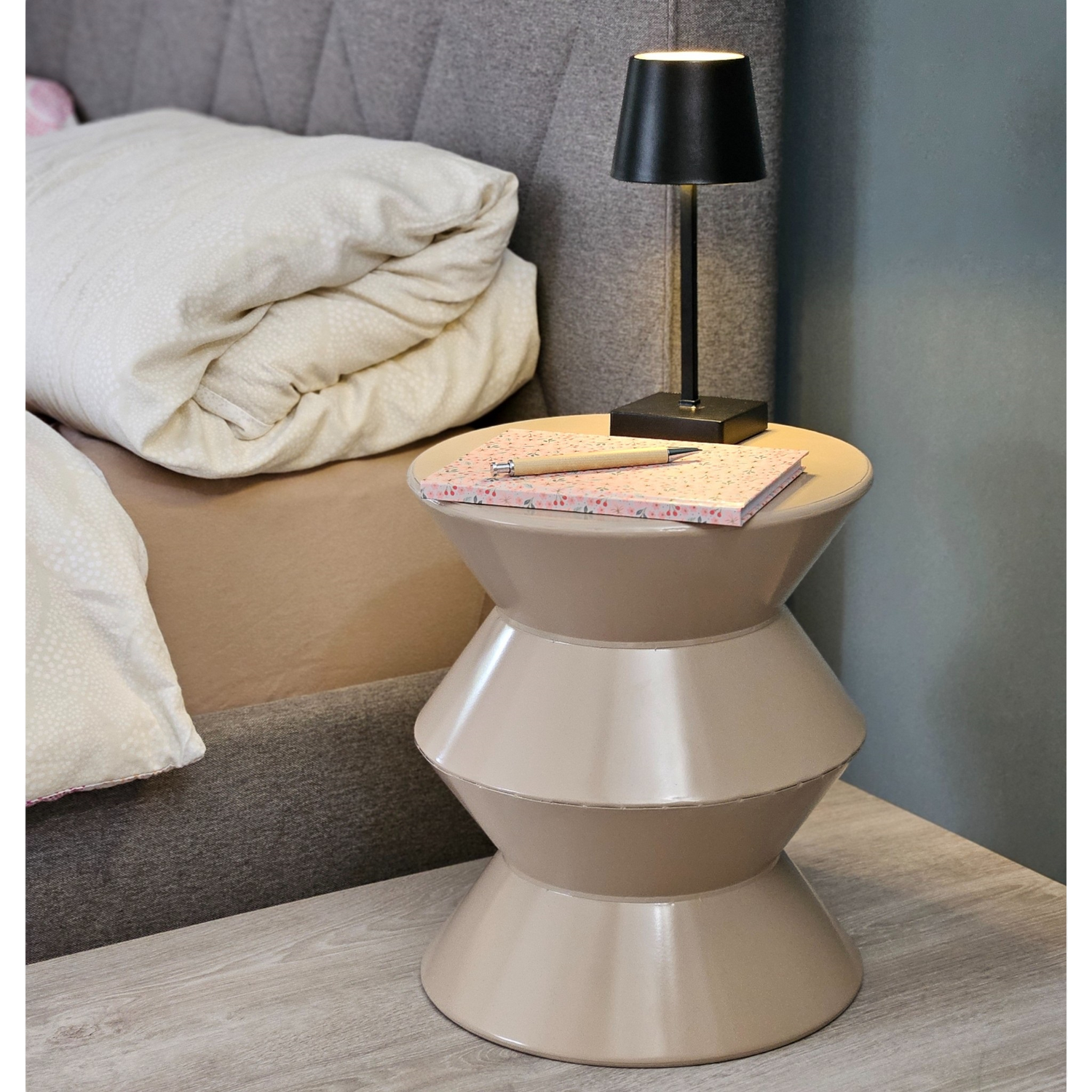 Mit seiner kompakten Größe (Durchmesser ca. 37 cm, Höhe ca. 30 cm) ist der Beistelltisch die perfekte Ergänzung zu Ihrem Sofa, Bett oder Lieblingssessel. Dank seines hohlen Innenraums bietet er zusätzliche Aufbewahrungsmöglichkeiten: Einfach umdrehen, und schon können Sie Zeitschriften, Kissen oder andere Gegenstände dezent verstauen.