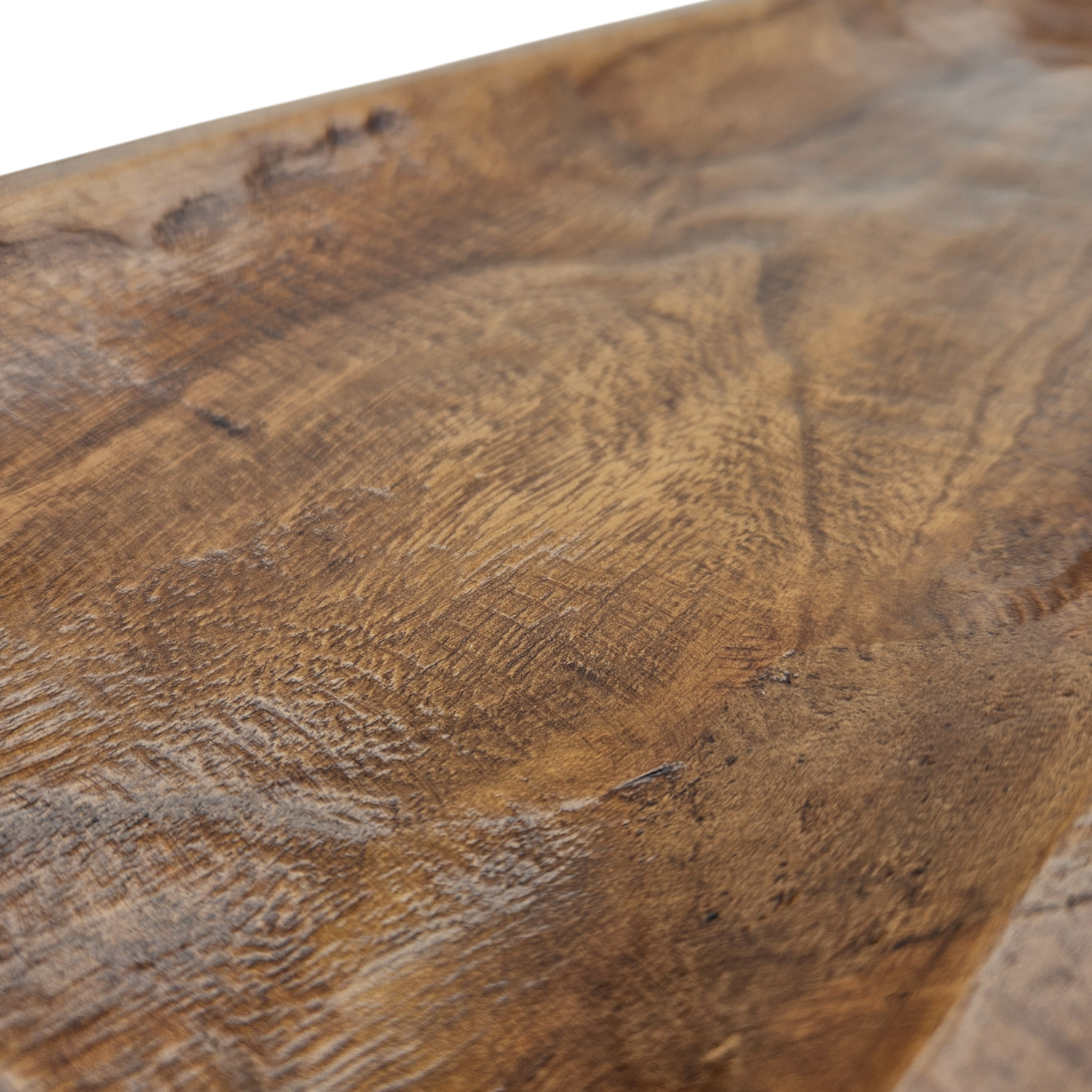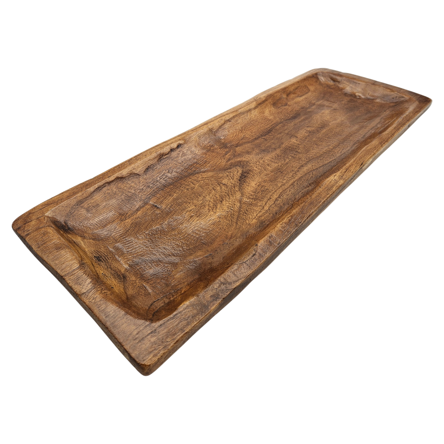Erleben Sie das behagliche Ambiente, das unser Holzbrett 58 cm in Ihr Zuhause bringt. Liebhaber natürlicher Materialien und zeitloser Dekorationen werden an diesem formschönen Accessoire in warmem Braun ihre Freude haben. Die elegante längliche Schalenform setzt stilvolle Akzente auf Ihrem Tisch, Sideboard oder in der Fensterbank.