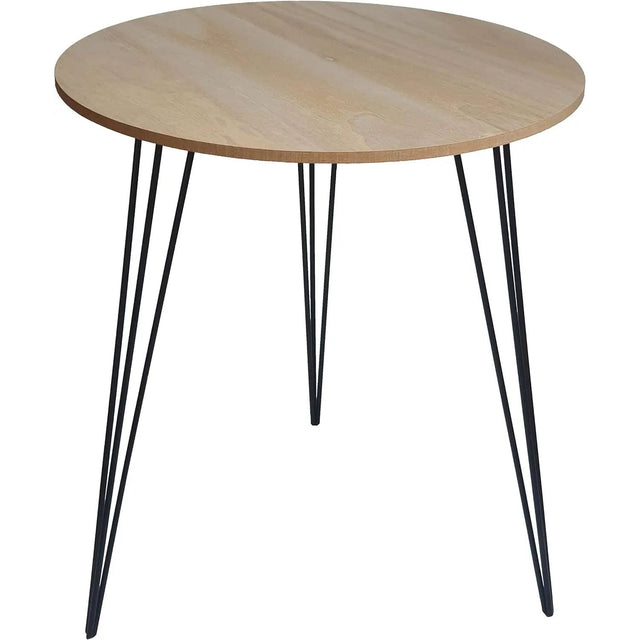Runder Tisch mit hellbrauner Holzplatte und schwarzen Metallbeinen.