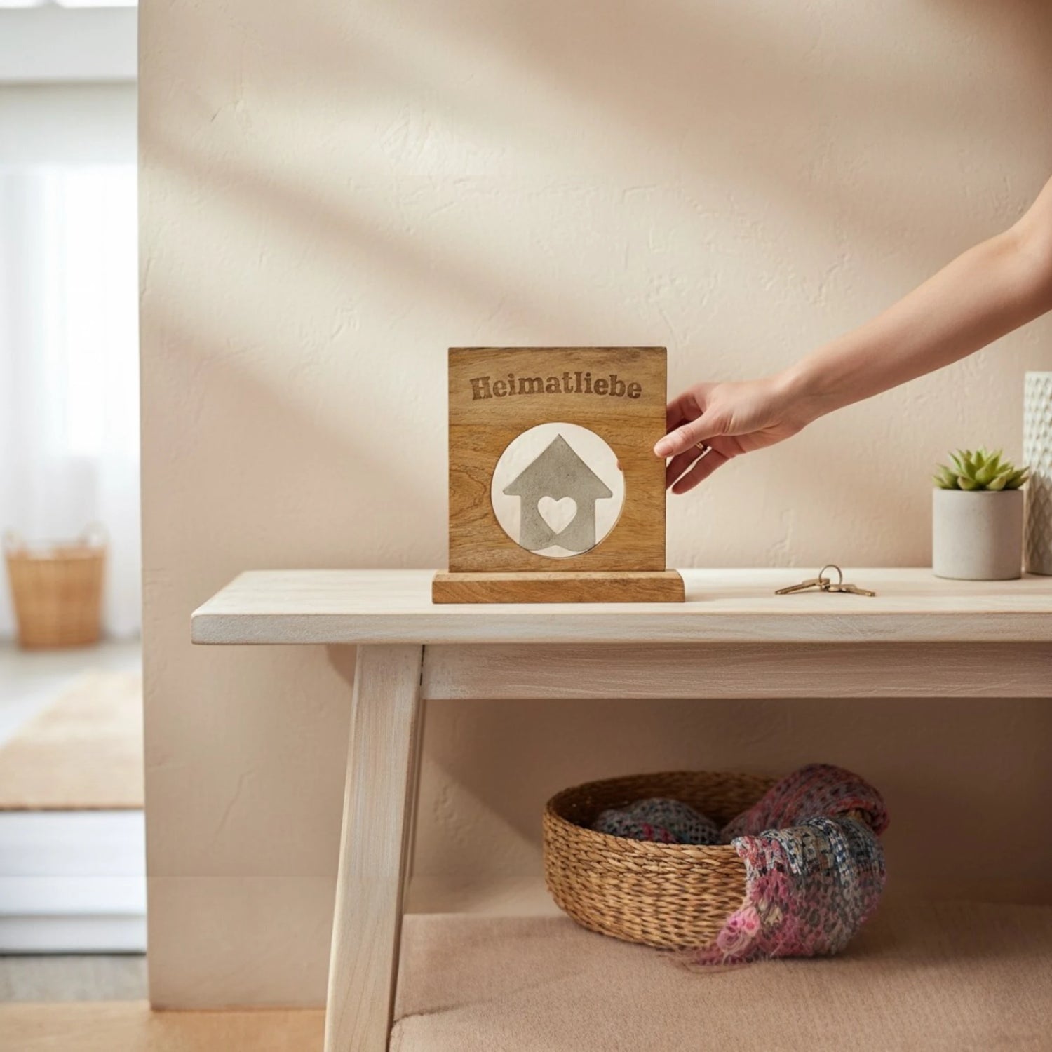 Nutzen Sie den Dekoaufsteller Heimatliebe als inspirierende Dekoration oder als symbolisches Willkommenszeichen – er fügt sich harmonisch in verschiedene Wohnstile ein und strahlt rustikale Natürlichkeit sowie moderne Eleganz aus.