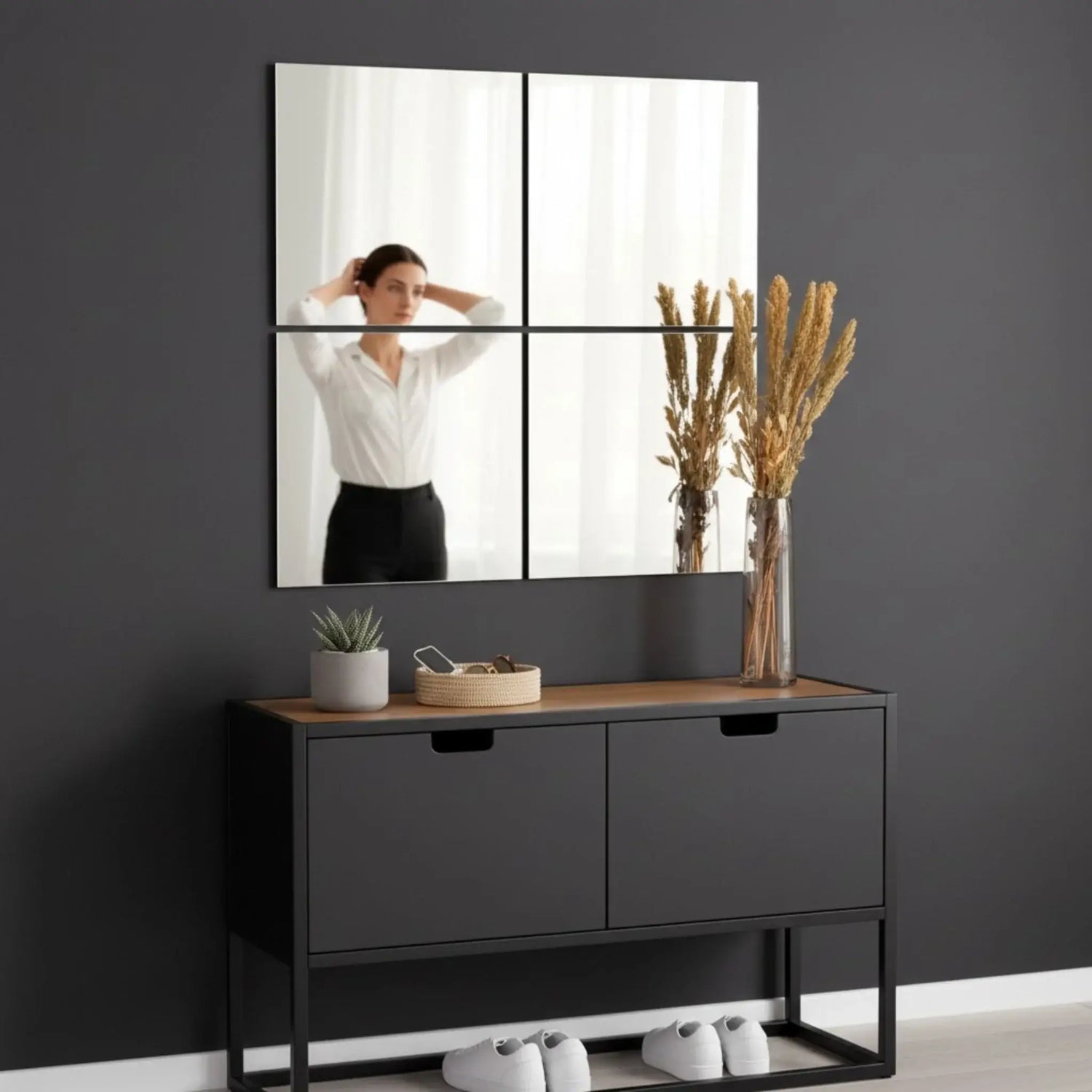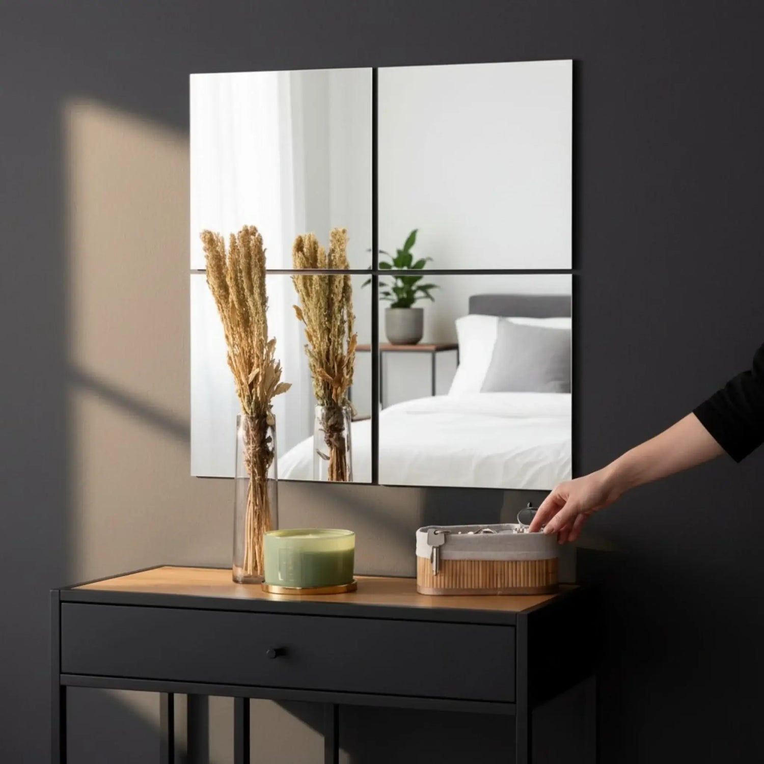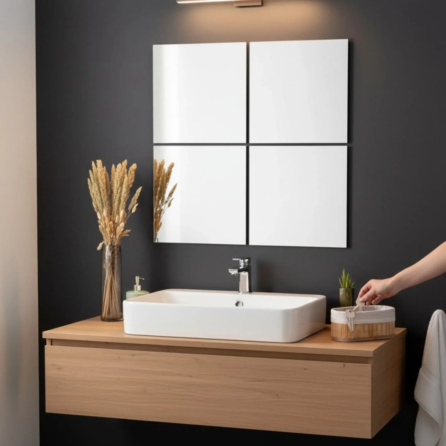 Nutzen Sie die Spiegelfliesen nicht nur als Spiegel, sondern auch als kreatives Dekoelement, das Ihren Wänden einen besonderen Akzent verleiht – einzeln, als Mosaik oder in individuellen Mustern angeordnet.